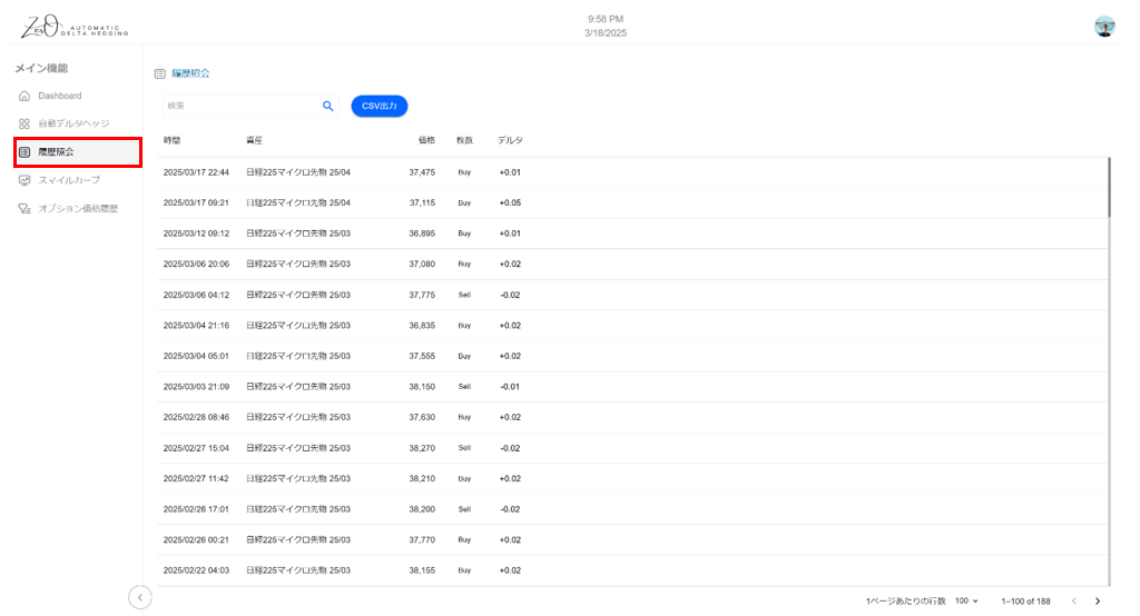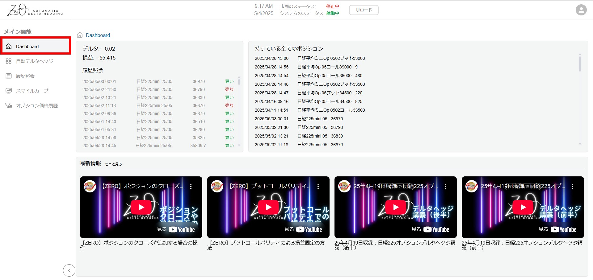 ・「ダッシュボード」ページで、ポジション、デルタ、損益、デルタヘッジの履歴が確認できる。