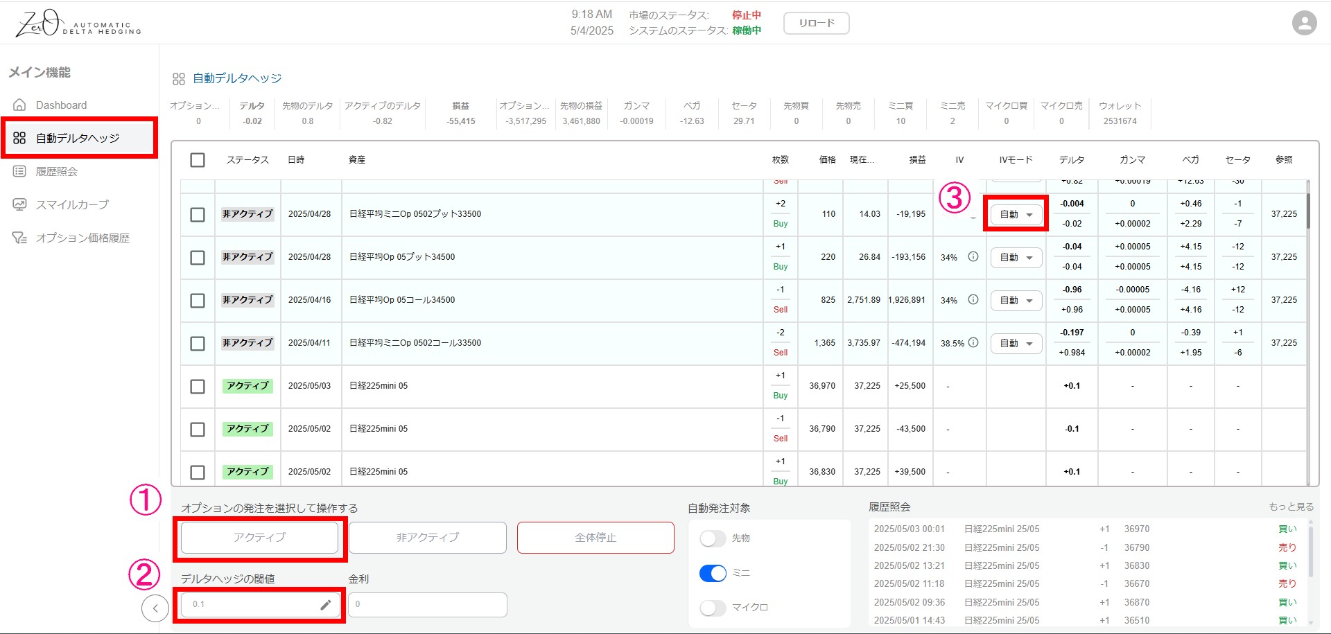 デルタヘッジ停止条件や対処法は「困った時は」に記載しています。