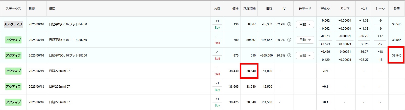 この「デルタ」の数値は、左から3番目の「先物のデルタ(アクティブ化されている先物のデルタ合計)」+左から4番目の「アクティブのデルタ(=アクティブ化されているオプションのデルタ合計)」です。
