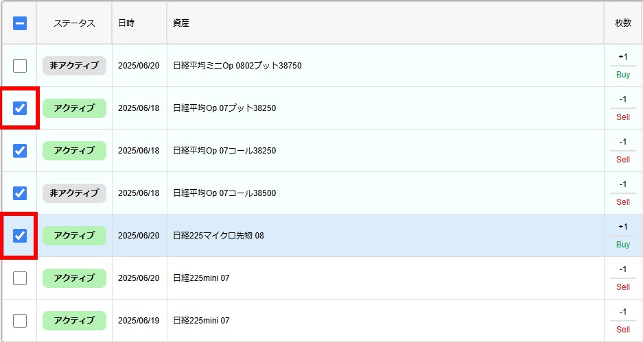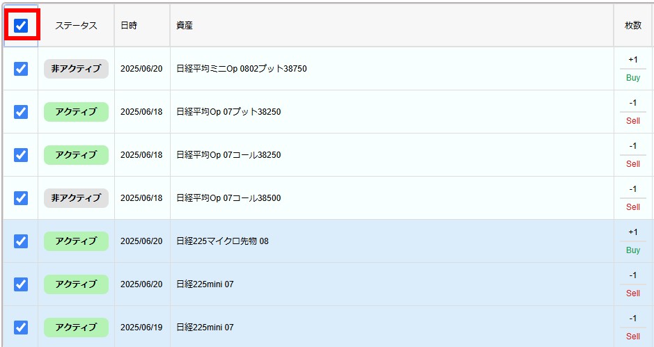 3.当ツールは、保有するオプション(アクティブ設定したもの=デルタヘッジ対象)と保有する先物等の合計デルタを算出し、各自が設定した閾値に到達した時点で、そのデルタの値が±0に近づくように先物等を自動売買するものであり、個別のオプション毎にデルタヘッジを行うものではありません。なお、デルタヘッジの対象にしないオプションを個別に設定することは可能です(非アクティブ化)。