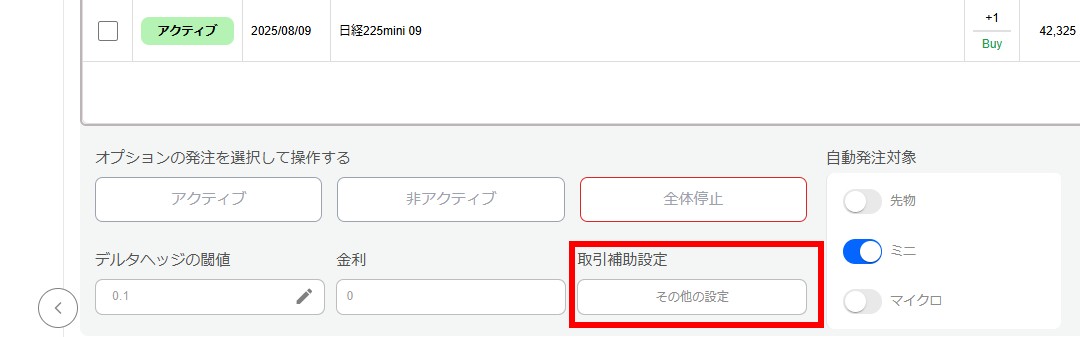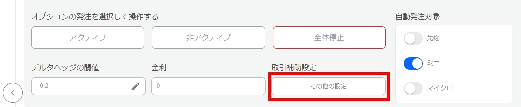 取引補助設定による異常枚数の検知の設定を超えた場合に自動デルタヘッジを停止する。