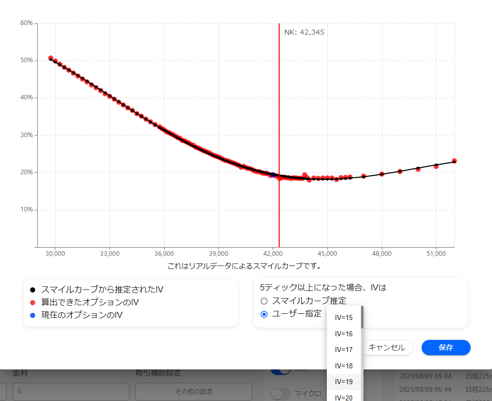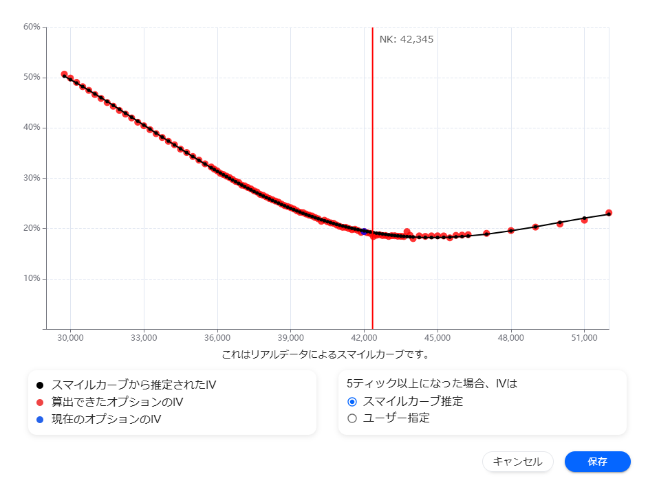 7.ボラティリティは、①現在のオプション価格(気配加重平均中値)、②プットコールパリティ、③スマイルカーブによる推定、④投資家の決定する数値、の4つの方法により決定します。夜間取引においてオプション価格がつかない場合にも③の方法によってボラティリティを推定しますが、すべてのオプション価格が算出できない場合にはスマイルカーブが描けない可能性があります。この場合に備えて、夜間取引に入るところで、大引けのIV等を参考に、ご自身でボラティリティを決定する方法(④)もご検討ください。