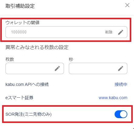 また、先物ミニに限りSOR注文を出すことができる。(初期状態はSOR注文がONのため、解除する場合はチェックを外すこと)