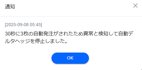 もし設定値を超えた場合にはメールとメイン画面にポップアップでデルタヘッジ停止の連絡が行われる。(下記は3枚30秒で設定した場合の通知)