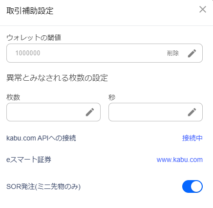 画面の下方にある「取引補助設定」のその他設定をクリックして設定が可能。
